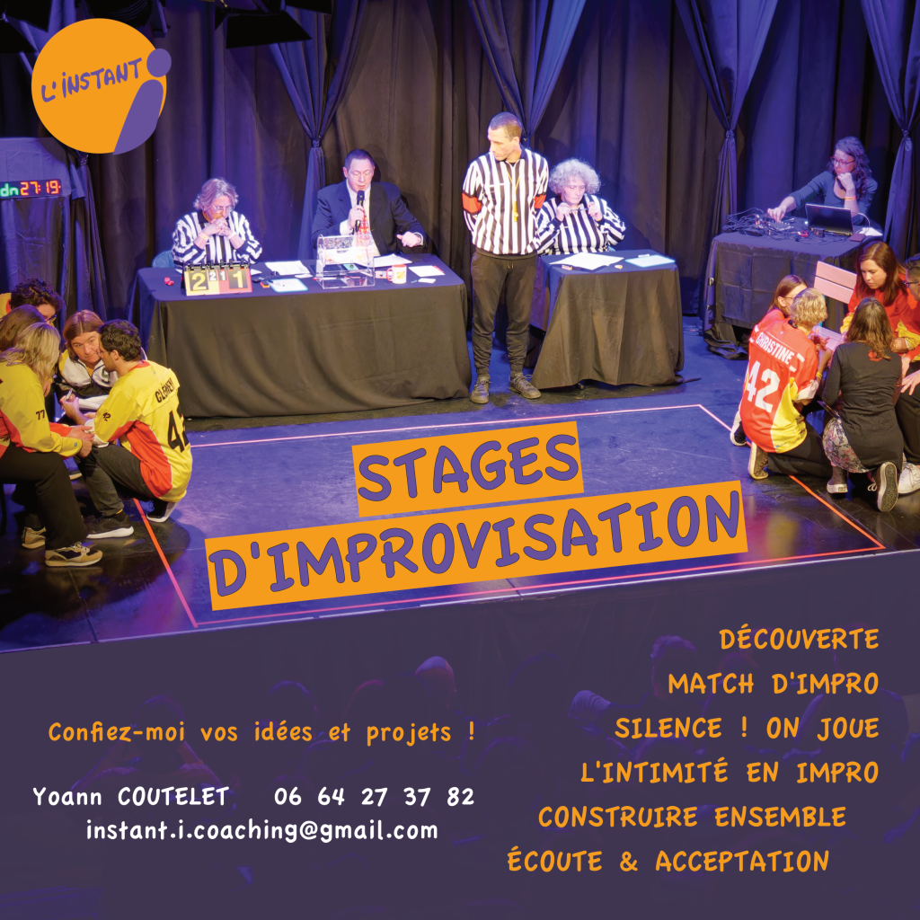 Coach en improvisation théâtrale avec cours réguliers et stages ponctuels.